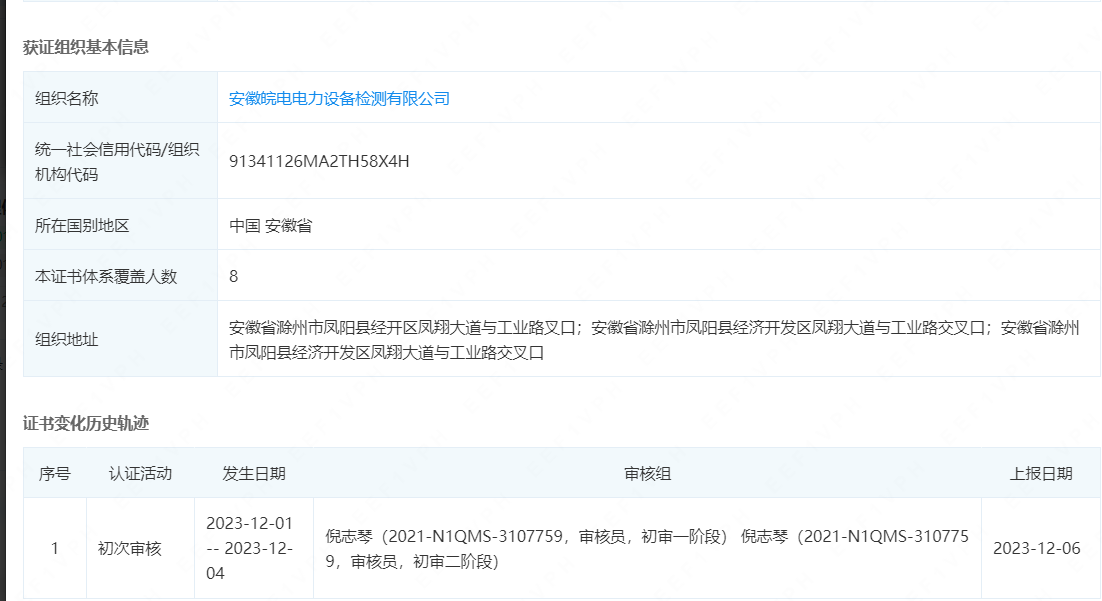 安徽皖电电力设备检测有限公司于2023年12月6日荣获质量管理体系认证证书