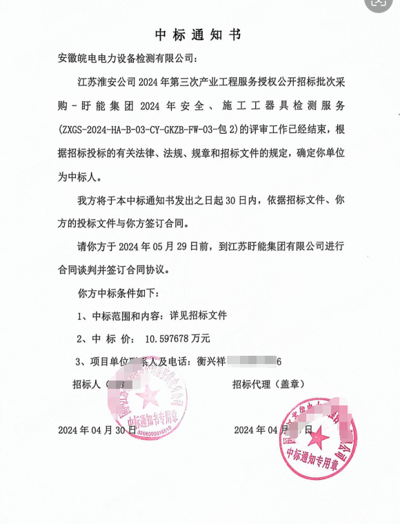 江苏淮安公司 2024 年第三次产业工程服务授权公开招标批次采购-盱能集团2024年安全、施工工器具检测服务(ZXGS-2024-HA-B-03-CY-GKZB-FW-03-包2)的评审工作已经结束,根据招标投标的有关法律、法规、规章和招标文件的规定,确定你单位为中标人。
