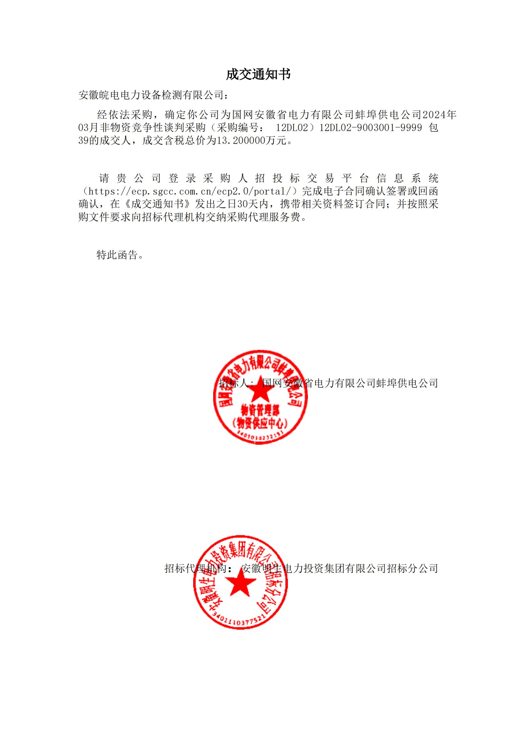 经依法采购,确定你公司为国网安徽省电力有限公司蚌埠供电公司2024年03月非物资竞争性谈判采购(采购编号:12DL02)12DL02-9003001-9999包39的成交人,成交含税总价为13.200000万元。